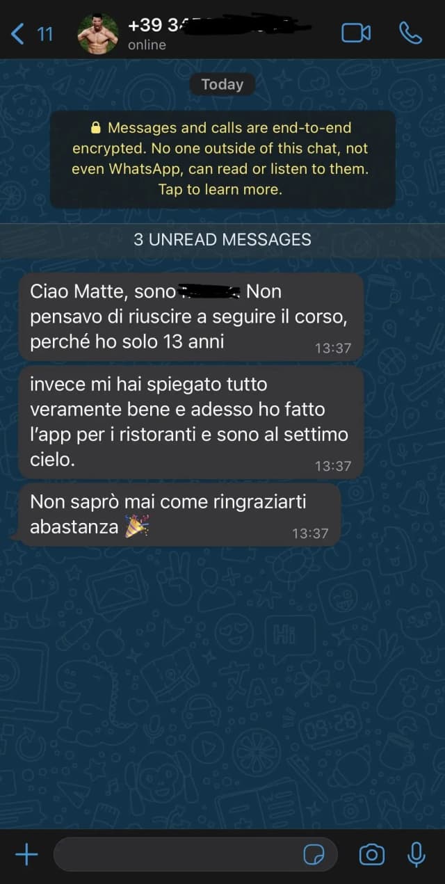 "Mi ha parlato di Matteo un amico. All’inizio avevo qualche dubbio che potesse realmente aiutarmi, ma ora non posso che consigliare questo corso a chiunque!. Spiegazioni chiarissime, anche per me che non avevo mai programmato prima. Grazie Matteo!"